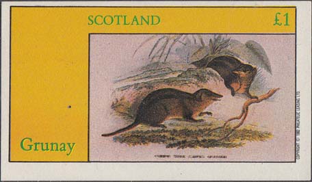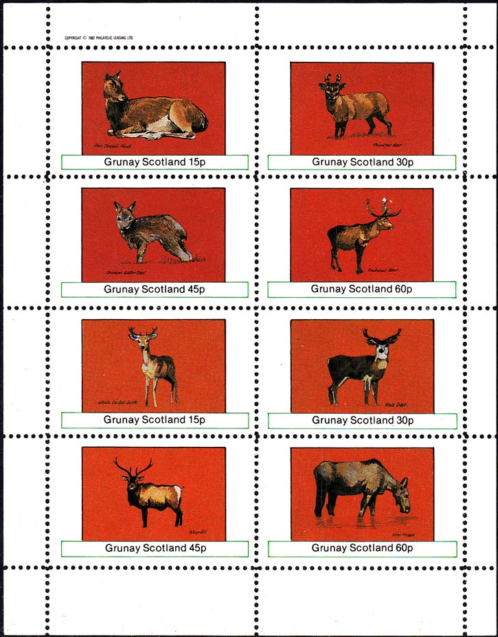 1982 г. Разм. рис. 35 х 22 мм. Многоцветная печать на белой глянцевой бумаге. Зубц. лин. 10 3/4. С клеем. В прямоугольной рамке в центре изображения различных животных и пояснительный текст на английском языке. Внизу текст на английском языке: "Grunay scotland" и номинал.
