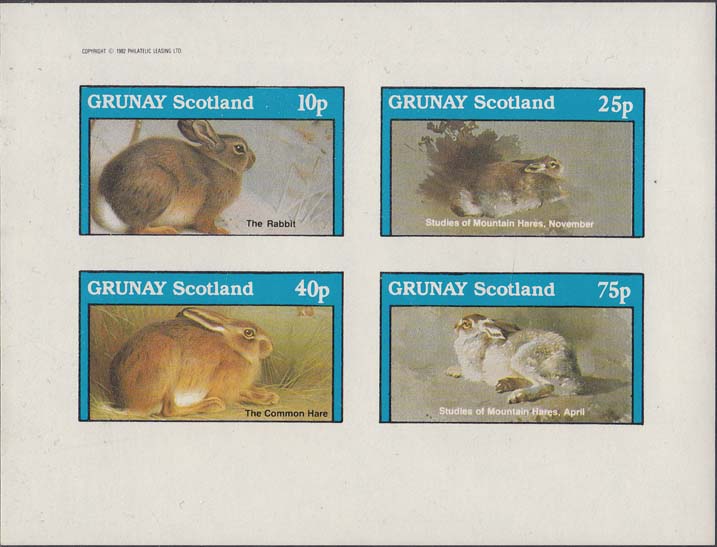 1982 г. Разм. рис. 44 х 25 мм. Многоцветная печать на белой глянцевой бумаге. с Клеем. В центре изображение кроликов различных пород и пояснительный текст на английском языке. Сверху текст на английском языке: "Gruney Scotland" и номинал.