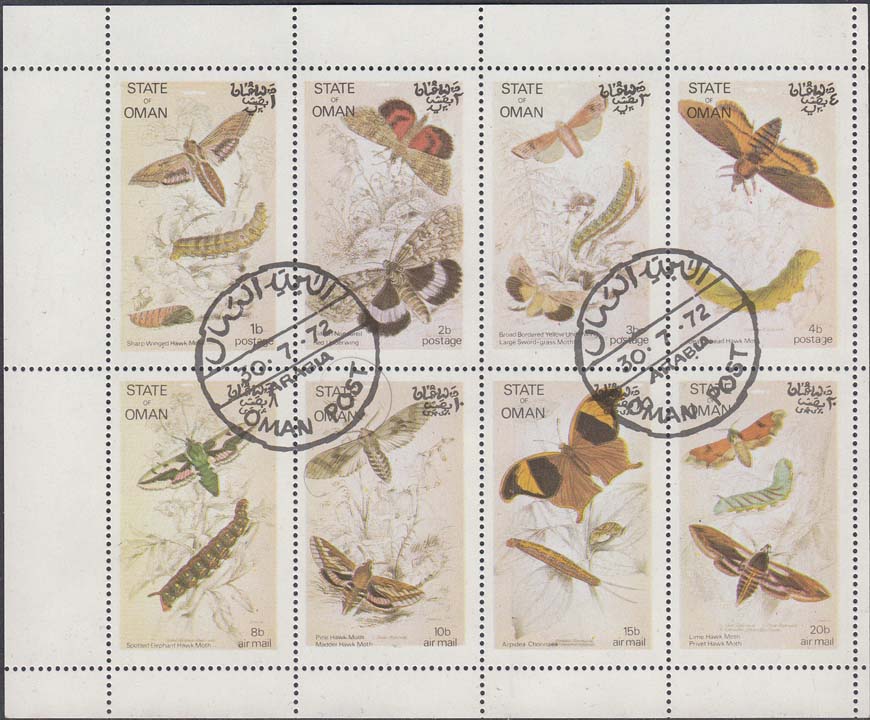 1972 г. Разм. рис. 38 х 58 мм. Многоцветная печать на белой бумаге. Зубц. 12 3/4. В прямоугольной рамке в центре на сплошном фоне изображение бабочек различных видов с пояснительным текстом. Внизу название страны на английском и арабском языках и номинал.
