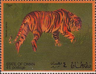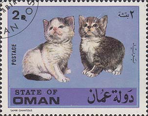 1970 г. Разм. рис. 45 х 35 мм. Многоцветная печать на белой бумаге. Зубц. 14 х 14 1/2. В центре на сплошном фоне кошки различных пород. Номинал и тексты на английском и арабском языке.