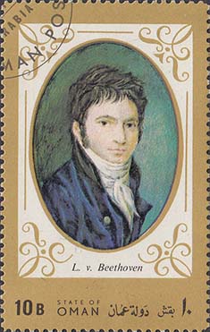 1972(?) г. Разм. по перфорации 39 х 63 и 80 х 63 мм. Многоцветная печать на белой бумаге. Зубц. 11 1/4. В центре различные портреты Бетховена. Тексты на английском и на арабском языке.