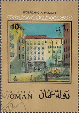 1972 г. Разм. по перфорации 44 х 64 мм. Многоцветная печать на белой бумаге. Зубц. 12. В центре различные сюжеты, посвященные Моцарту.