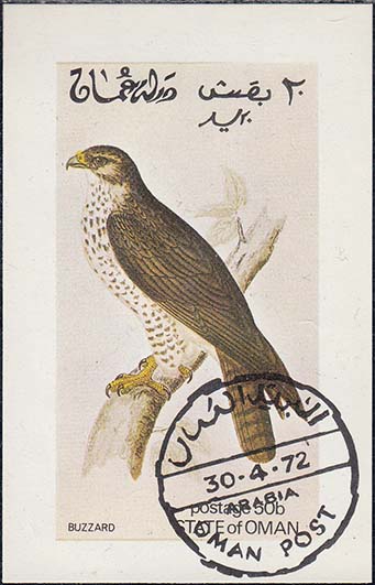 1972 г. Разм. 57 х 89 мм. В центре хищная птица. Тексты на английском и арабском языке.