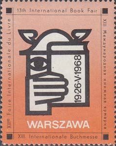 1968 г. 19.05.1968 г. Разм. рамки 31 х 41 мм. Трехцветная печать на белой мелованной бумаге. Зубц. 11 1/2. С клеем. В прямоугольной рамке в центре эмблема Варшавской книжной ярмарки и даты: "19-26-V-1968" . Внизу текст на польском языке: "Варшава". По наружному периметру рамки текст на английском. немецком, французском и русском языках: "XIII Международная книжная ярмарка".