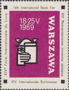 1969 г. Разм. рис.29 х 38 мм. Двухцветная печать на белой мелованной бумаге. Зубц. 12 1/2. С клеем. В центре на сплошном фоне эмблема Варшавской книжной ярмарки и даты: "18-26 V 1969". Справа текст на польском языке: "Варшава". По наружному периметру рамки текст на английском, немецком, французском и русском языках: "XIV Международная книжная ярмарка".