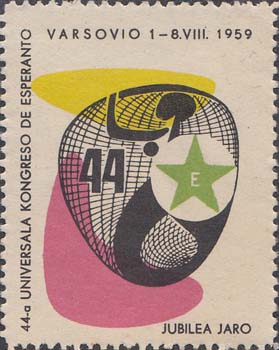 1959 г. 01.08.1959 г. Разм. по перфорации 38 х 48 мм. Многоцветная печать на белой бумаге. Зубц. 10 3/4. С клеем. В центре эмблема Конгресса. По периметру текст на языке эсперанто: "44-й международный конгресс по эсперанто. Варшава 1-8.VIII.1959".