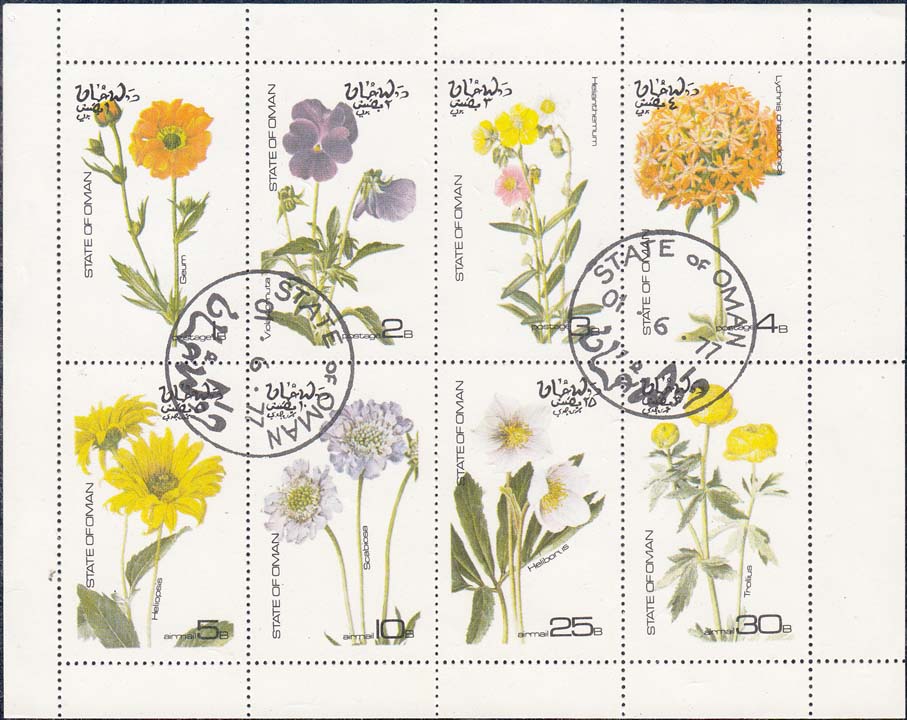 1977 г. Блок разм. 45 х 78 мм. Многоцветная печать на белой глянцевой бумаге. В центре изображения различных растений. По периметру тексты на арабском и английском языках и номинал.