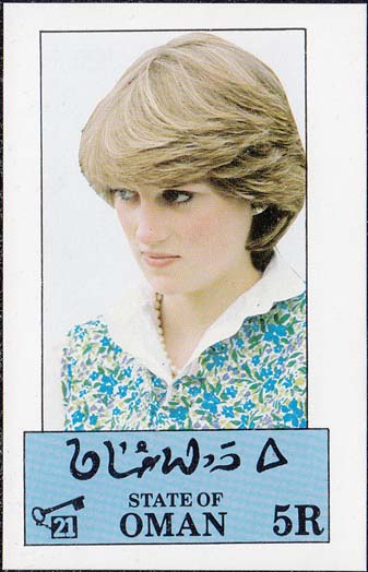 1982 г. Блок разм. 57 х 89 мм. Многоцветная печать на белой глянцевой бумаге. В цетре в прямоугольной рамке портрет Принцессы Дианы. Внизу название региона на арабском и английском языках и номинал.