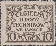 1920(?) г. Разм. рамки 29 х 22 мм. Одноцветная печать на белой бумаге. Нерегулярная зубц. С клеем(?). В декоративной рамке в цент ре текст в четыре сроки: "Кирпич для дома техников во Львове". Внизу номинал.