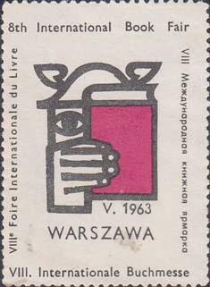 1963 г. Разм. 39 х 54 мм. Двухцветная печать на белой мелованной бумаге. Зубц. 11. С клеем. В центре эмблема Варшавской книжной ярмарки и даты: "V-1963" . Внизу текст на польском языке: "Варшава". По наружному периметру рамки текст на английском, немецком, французском и русском языках: "VIII Международная книжная ярмарка".