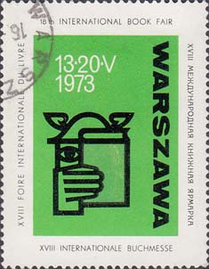 1973 г. 13-20.05.1973 г. Разм. по перфорации 39 х 50 мм. Трехцветная печать на белой мелованной бумаге. Зубц. 12 1/2. С клеем. В центре на сплошном фоне эмблема Варшавской книжной ярмарки и даты: "13-20 V 1973". Справа текст на польском языке: "Варшава". По наружному периметру рамки текст на английском, немецком, французском и русском языках: "XVIII Международная книжная ярмарка".