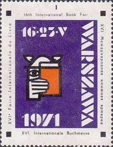 1971 г. 16-23.05.1971 г. Разм. по перфорации 39 х 50 мм. Трехцветная печать на белой мелованной бумаге. Зубц. 12 1/2. С клеем. В центре на сплошном фоне эмблема Варшавской книжной ярмарки и даты: "16-25 V 1971". Справа текст на польском языке: "Варшава". По наружному периметру рамки текст на английском, немецком, французском и русском языках: "XVI Международная книжная ярмарка".