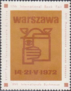 1972 г. 14-21.05.1972 г. Разм. рис. 29 х 40 мм. Многоцветная печать на белой мелованной бумаге. Зубц. 12 1/2. С клеем. В центре на сплошном фоне эмблема Варшавской книжной ярмарки. Сверху текст на польском языке: "Варшава". Внизу даты: "18-23 V 1973". По наружному периметру рамки текст на английском, немецком, французском и русском языках: "XVII Международная книжная ярмарка".
