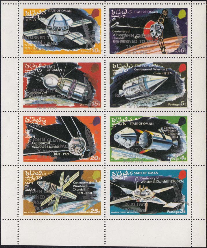1998 г. Серебристая надпечатка текста на английском языке: "Джон Гленн вернулся в космос 20.02.1996 20.10.1998" и силуэта космического корабля на марках выпуска, посвященных 10-летию миссии "Аполлон - 11".