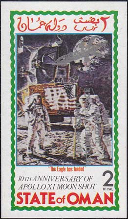 1998 г. Серебристая надпечатка текста на английском языке: "Джон Гленн вернулся в космос 20.02.1996 20.10.1998" и силуэта космического корабля на блоке выпуска, посвященных 10-летию миссии "Аполлон - 11".