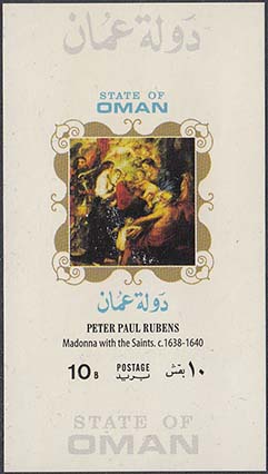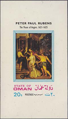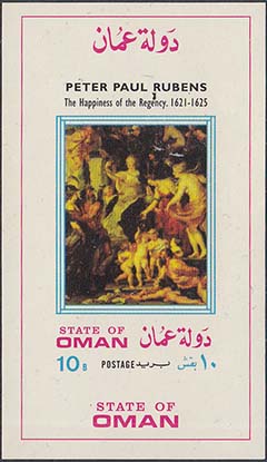 1980 г. Разм. 40 х 70 мм. Многоцветная печать на белой глянцевой бумаге. С клеем. В центре в двойной прямоугольной рамке картины Рубенса. Тексты на английском и арабском языке и номинал.