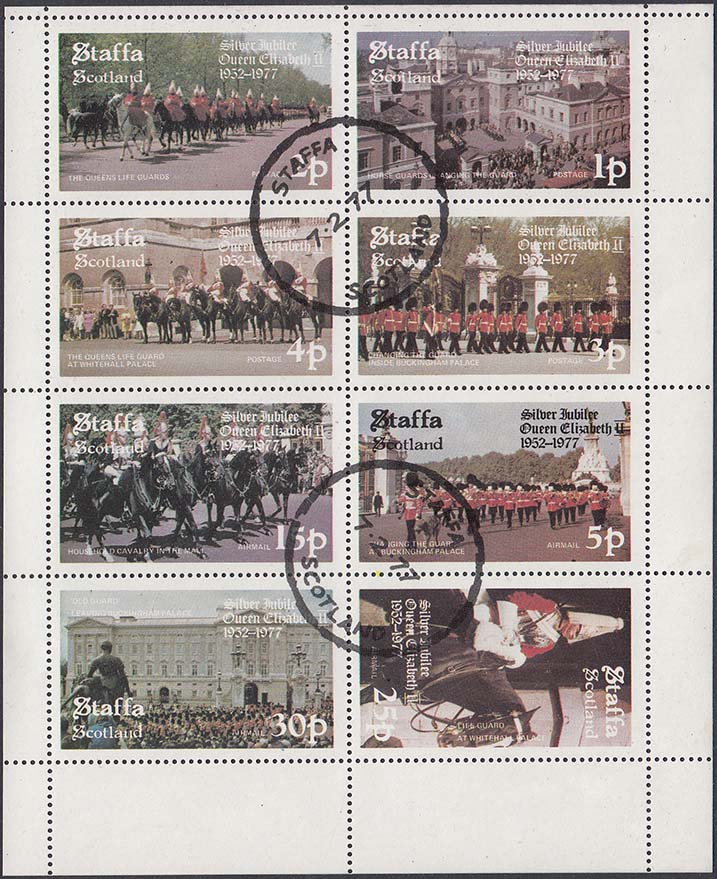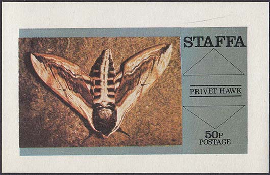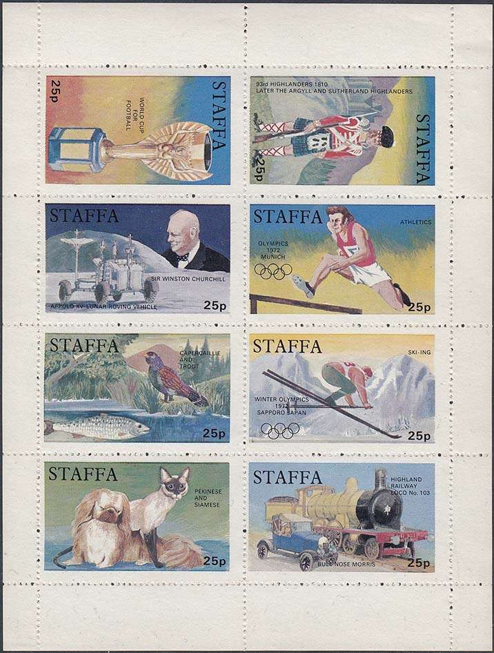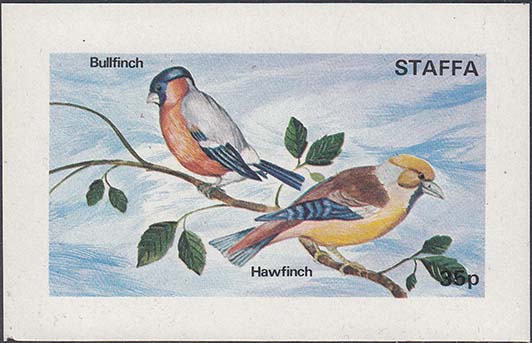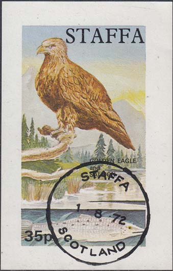 1972 г. . Разм. 57 х 89 мм. Многоцветная печать на белой глянцевой бумаге. В центре орел на ветке. В левом нижнем углу номинал. В правом верхнем углу текст на английском языке: «Staffa».