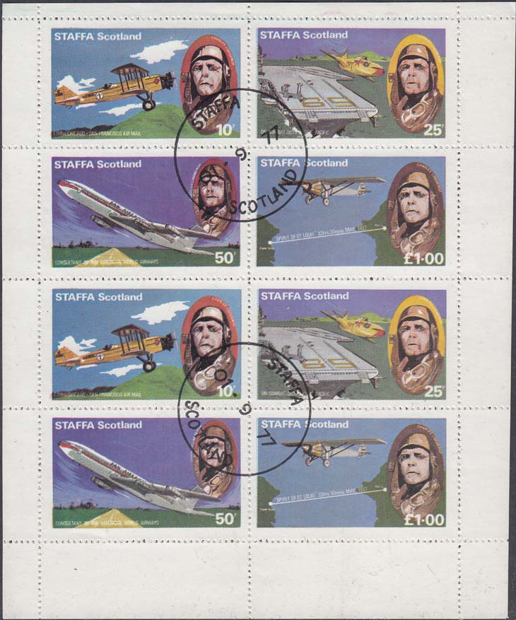 1977 г. Разм. рис. 45 х 26 мм. Многоцветная печать на белой бумаге. Зубц. 14. В центре различные самолеты и портрет летчика. По периметру номинал и название страны на английском языке.