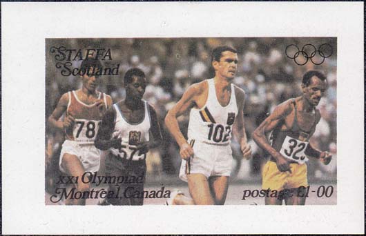 1976 г. Блок разм. 90 х 57 мм. Многоцветная печать на белой глянцевой бумаге. С клеем. В центре бегуны на дистанции. По периметру номинал и тексты на английском языке.