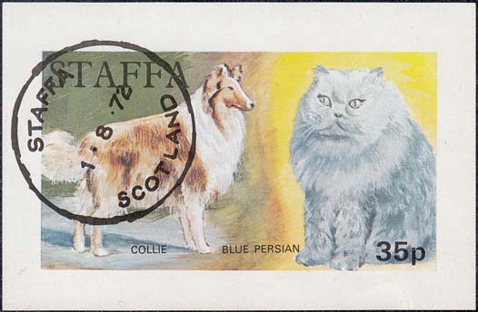 1972 г. Блок разм. 88 х 57 мм. Многоцветная печать на белой глянцевой бумаге. В центре собака и кошка. В левом верхнем углу название территории на английском языке. В правом нижнем углу номинал.
