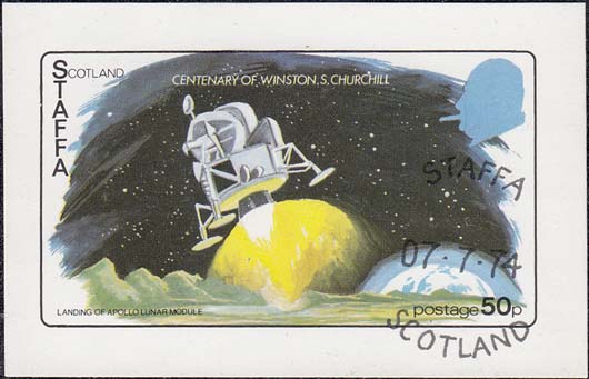 1974 г. Блок разм. 90 х 57 мм. Многоцветная печать на белой глянцевой бумаге. В прямоугольной рамке разм. 76 х 42 мм лунный модуль совершает посадку на Луне. В левом верхнем углу название территории на английском языке. В правом нижнем углу номинал.