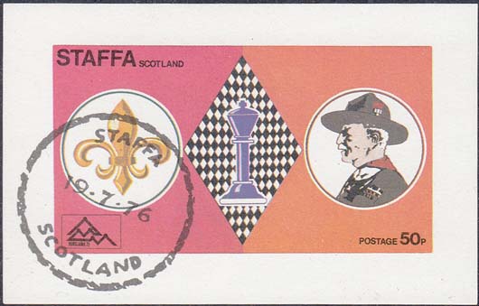 1976 г. Блок разм. 90 х 56 мм. Многоцветная печать на белой глянцевой бумаге. В центре на сплошном фоне ферзь на фоне шахматного поля. Слева скаутский значок. Справа портрет Р. Баден-Пауэла в профиль. По периметру номинал и тексты на английском языке.