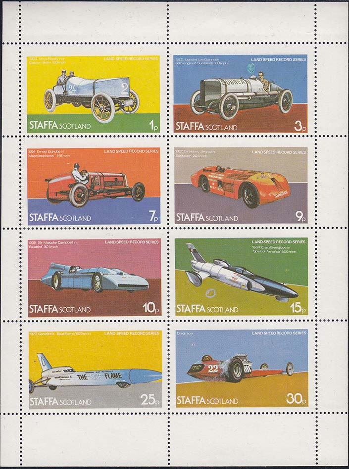 1977 г. Разм. рис 46 х 26 мм. Многоцветная печать на белой бумаге. Зубц. 14. С клеем. В центре скоростные автомобили различных моделей.