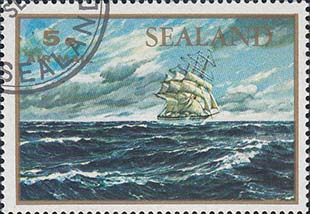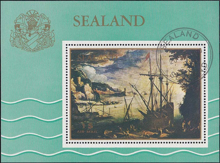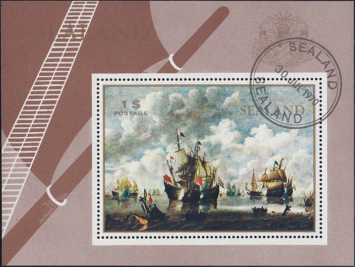 1970 г. Разм. х мм. Многоцветная печать на белой глянцевой бумаге. Зубц. В центре парусные корабли на рейде. На полях носовая часть парусного корабля и герб Сиаленда.