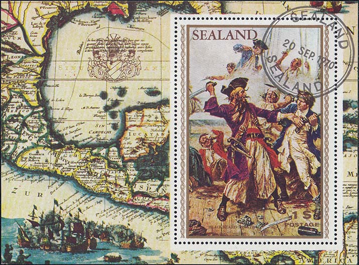1970 г. разм. х мм. Многоцветная печать на белой глянцевой бумаге. Зубц. . С клеем. В центре бой пирата Черная Борода с лейтенантом Мэйнардом.