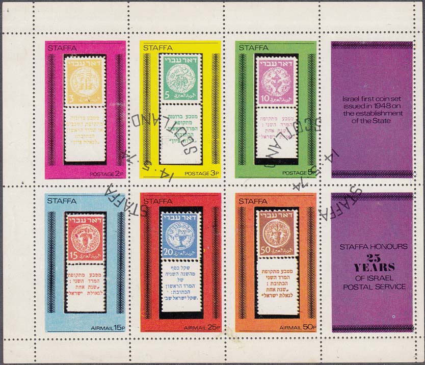 1974 г. Разм. рис. 27 х 46 мм. Многоцветная печать на белой глянцевой бумаге. Зубц. 14. В центре изображения почтовых марок Израиля. Название страны на и номинал на арабском языке.