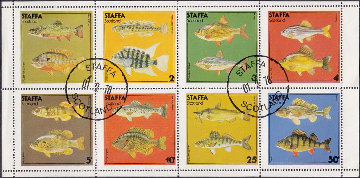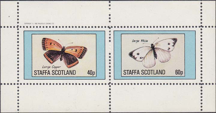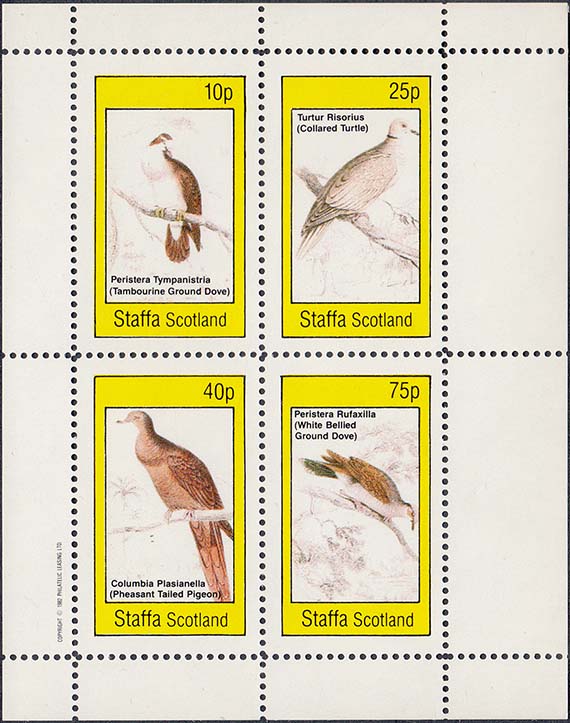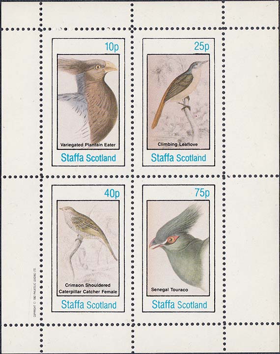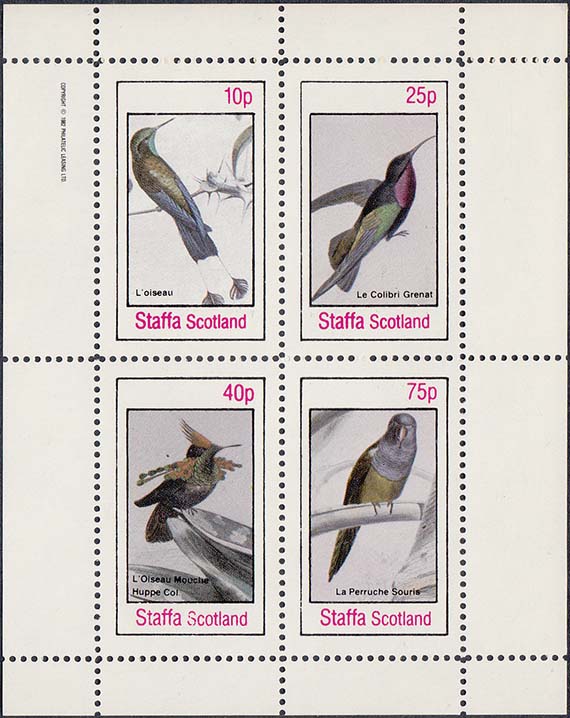1982 г. Разм. рамки 25 х 44 мм. Многоцветная печать на белой глянцевой бумаге. В прямоугольной рамке в центре птицы различных пород с пояснительным текстом на английском языке. Справа сверх номинал. Внизу текст на английском языке: "Staffa Scotland".