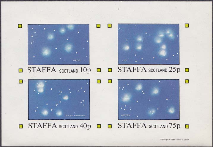 1981 г. Разм. рис. 35 х 23 мм. Трехцветная печать на белой глянцевой бумаге. Зубц. 10 3/4 и Б.З. С клеем. В центре изображения различных созвездий. Внизу название территории на английском языке и номинал.