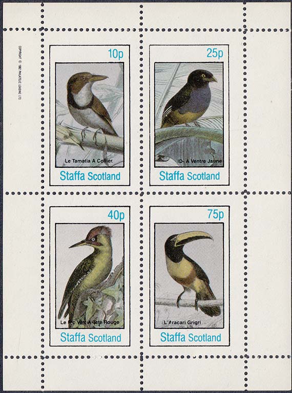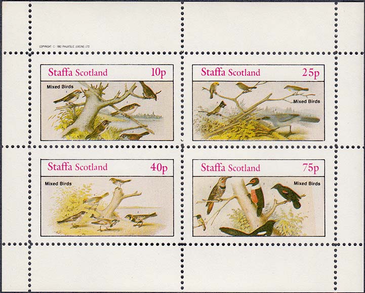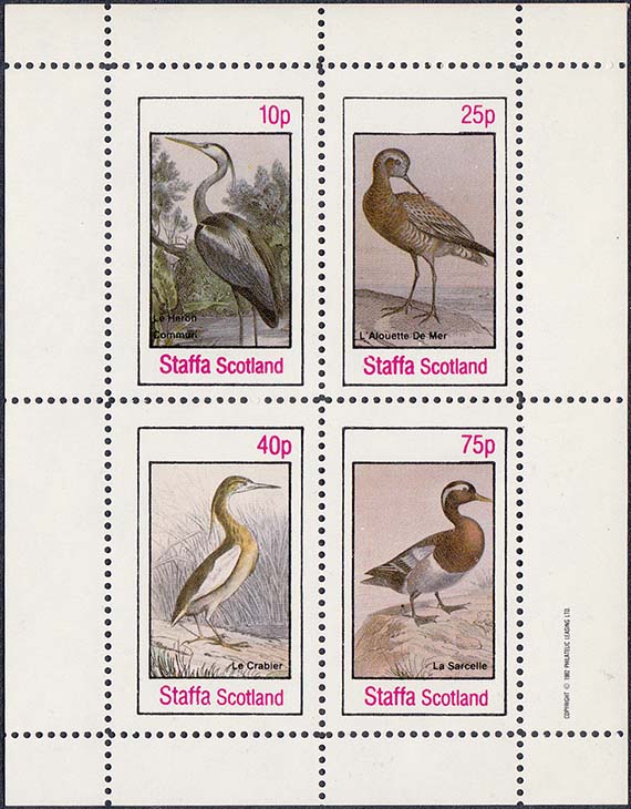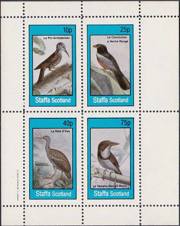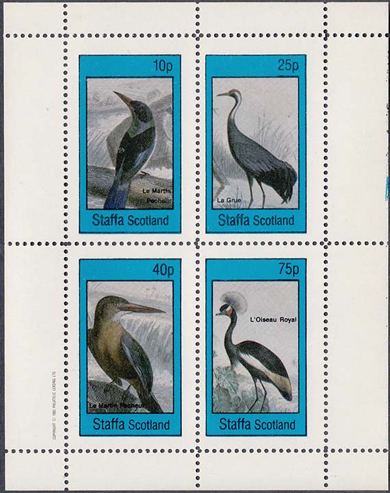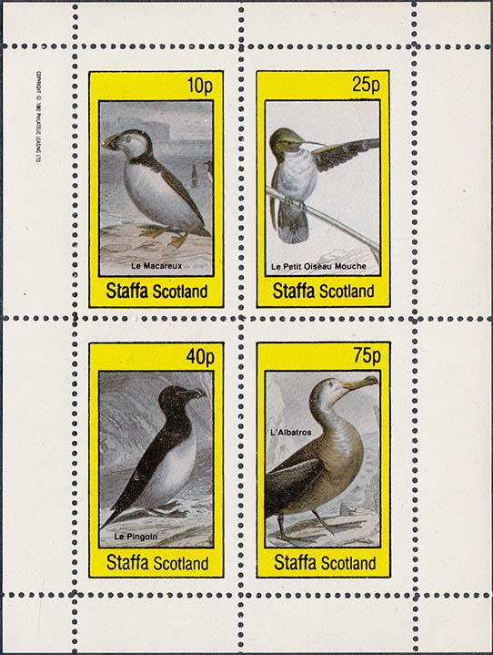 1982 г. Разм. рамки 25 х 44 мм. Многоцветная печать на белой бумаге. В прямоугольной рамке в центре птицы различных видов с пояснительными текстами на английском языке. В правом верхнем углу номинал. Внизу текст на английском языке: "Staffa Scotland".