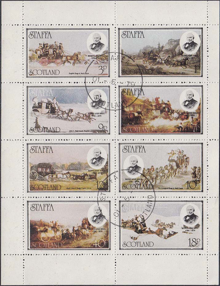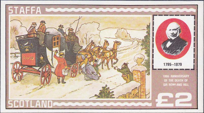 1979 г. Листок разм. рис. 136 х 75 мм. Многоцветная печать на белой глянцевой бумаге. В центре почтовая карета. Справа портрет Р. Хилла. Тексты на английском языке.