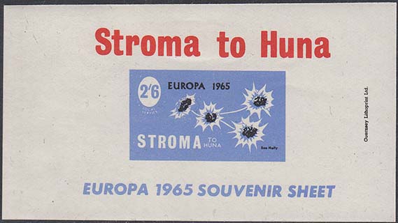 1969 г. Блок разм. 84 х 67 мм. Многоцветная печать на белой бумаге. С клеем. В центре на марке раз-личные рисунки. Внизу номинал и название территории на английском языке. На полях блока продолжение рисунка и текст на английском языке: «Остров Строма».