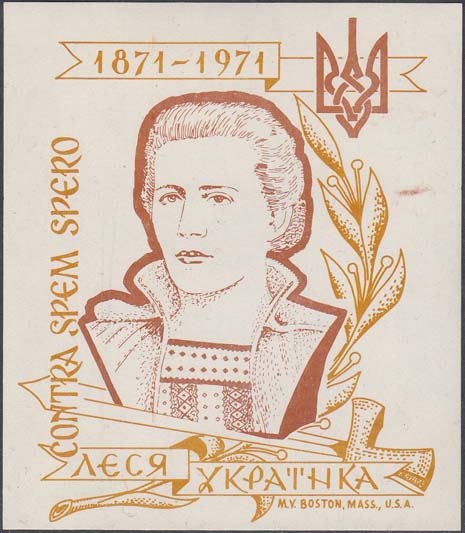 1971 г. Листок разм. 134 х 83 мм. В центре в прямоугольной рамке разм. 109 х 51 мм портреты Леси украинки в обрамлении декоративных элементов и тексты на украинском языке. На полях текст на английском языке.