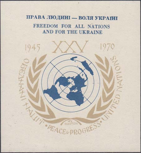 1970 г. Разм. 76 х 83 мм. Двухцветная печать на белой глянцевой бумаге. С клеем. В центре эмблема ООН и дата: "1945 XXV 1970". Сверху текст на украинском языке: "Права человека - свобода Украины". Ниже текст в две строки на английском языке: "Свободу для всех наций и для Украины".