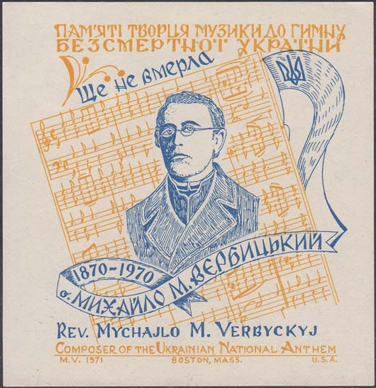 1971 г. Разм. 89 х 92 мм. Двухцветная печать на белой глянцевой бумаге. С клеем. В центре на фоне нот гимна Украины портрет композитора М.Вербицкого. В центре на ленте текст на украинском языке: "1870-1970. Михаил М. Вербицкий". Сверху текст в две строки на украинском языке: "Памяти автора музыки к гимну бессмертной Украины". Внизу текст в две строки на английском языке: "Памяти Михаила М. Вербицкого автора музыки государственного гимна Украины".