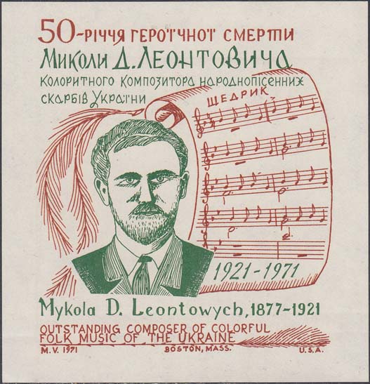 1971 г. Разм. 90 х 92 мм. Двухцветная печать на белой глянцевой бумаге. С клеем. В центре портрет композитора М.Леонтовича и ноты одного из его произведений. Тексты на украинском и английском языках.