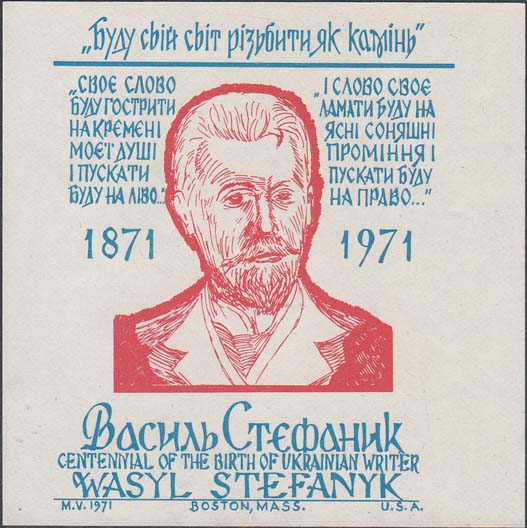 1971 г. Разм. 89 х 89 мм. Двухцветная печать на белой глянцевой бумаге. С клеем. В центре портрет украинского писателя Василия Стефаника и даты: "1871 1971". Сверху и снизу тексты на украинском и английском языках.