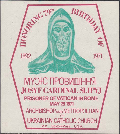 1971 г. Разм. 79 х 88 мм. Двухцветная печать на белой глянцевой бумаге. С клеем. В центре в шестиугольной рамке портрет кардинала Иосифа Слепого.