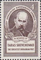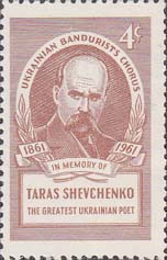 1961 г. Разм. рис. 21,5 х 34,5 мм. Одноцветная печать на белой бумаге. Зубц. лин. 12 1/2. С клеем. В центре в декоративной рамке портреты Т.Г. Шевченко в разные периоды жизни. Текст на английском языке: "Украинская капелла бандуристов. 1861 1961. В память о Тарасе Шевченко, величайшем украинском поэте".