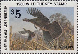 1980 г. Разм. рис. 42 х 28 мм. Многоцветная печать на белой глянцевой бумаге. Зубй. 11 3/4. С клеем. В центре две индейки, летящие над полем. В левом верхнем углу номинал. По наружному периметру рисунка тексты на английском языке.