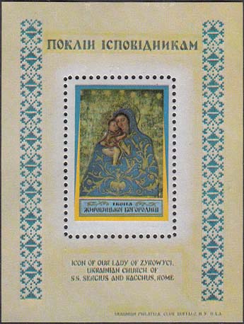 1980(?) г. Разм. рамки 57 х 77 мм. Многоцветная печать на белой мелованной бумаге. Зубц. 11 3/4. С клеем. В центре марка с изображением Иконы Жировичской Богоматери. Разм. рамки 22 х 32,5 мм. Внизу текст на украинском языке в две строки: «Икона Жировичской Богоматери». На полях блока сверху текст на украинском языке: «Поклон исповедникам». Внизу на полях блока текст на украинском языке в три строки. В правом нижнем углу выходные данные на украинском языке: «Украинский филателисти-ческий клуб. Буффало, США».