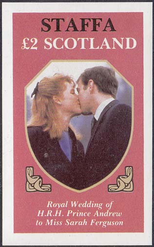 1986 г. Блок разм. 53 х 85 мм. Многоцветная печать на белой глянцевой бумаге. С клеем. В центре на сплошном фоне в рамке сложной формы в виде щитка Принц Эндрю и С.Фергюсон. Сверху название территории на английском языке и номинал. Внизу текст в три строки на английском.