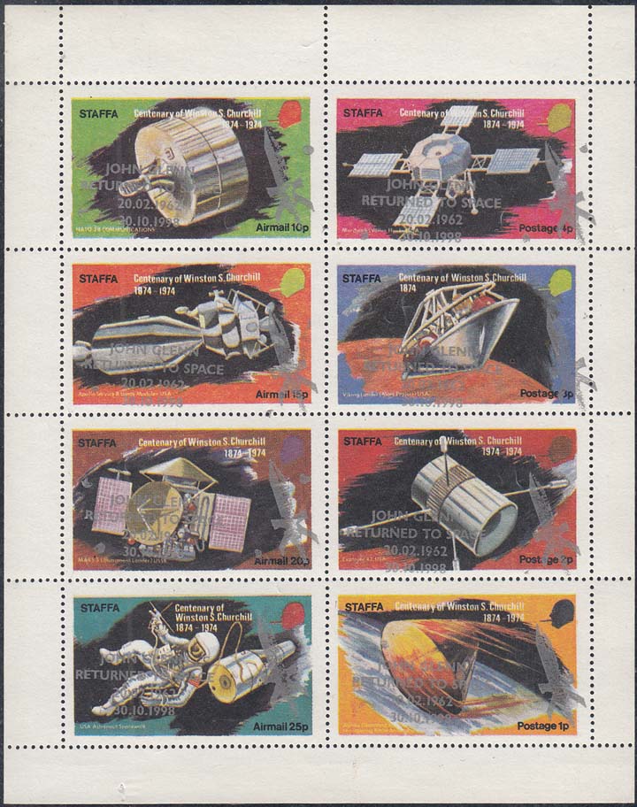 1998 г. Надпечатка различных цветов в виде стилизованного изображения ракеты и текста в четыре строки на английском языке: "Джон Гленн вернулся в космос 20.02.1962 30.10.1998" на листах и блоках выпуска 1974 г.