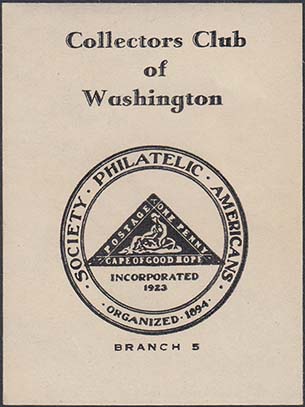 1950(?) г. Разм. 51 х 68 мм. Одноцветная печать на белой бумаге. В центре эмблема Американского филателистического общества. Сверху текст в три строки на английском языке: "Клуб коллекционеров Вашингтона". Внизу текст на английском языке: "Филиал 5".