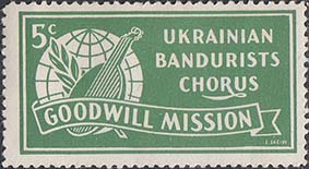 1960 г. 4 Разм. рамки 42,5 х 22,5 мм. Одноцветная печать на белой бумаге. Зубц. 12 1/2. С клеем. Сдева изображение земного шара, лавровая ветвь и бандура. Справа текст в четыре строки на английском языке: "Украинский хор бандуристов. Миссия доброй воли".