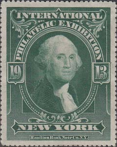 1913 г. Разм. рис. 36 х 46 мм. Одноцветная металлография на белой бумаге. Зубц. 11 3/4. С клеем. В центре в декоративной рамке портрет Джорджа Вашингтона. По периметру текст на английском языке: "Международная филателистическая выставка Нью-Йорк 1913".