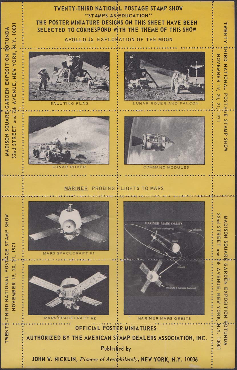 1971 г. Разм. по перфорации 52 х 36 мм. Двухцветная печать на белой бумаге. Зубц. 12 1/2. С клеем. В центре различные рисунки, посвященные американским программам Аполлон и Маринер.